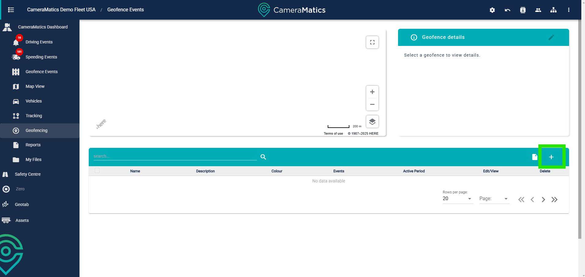 This displays a list of existing geofences. To create a new geofence, simply click on the + button highlighted below.