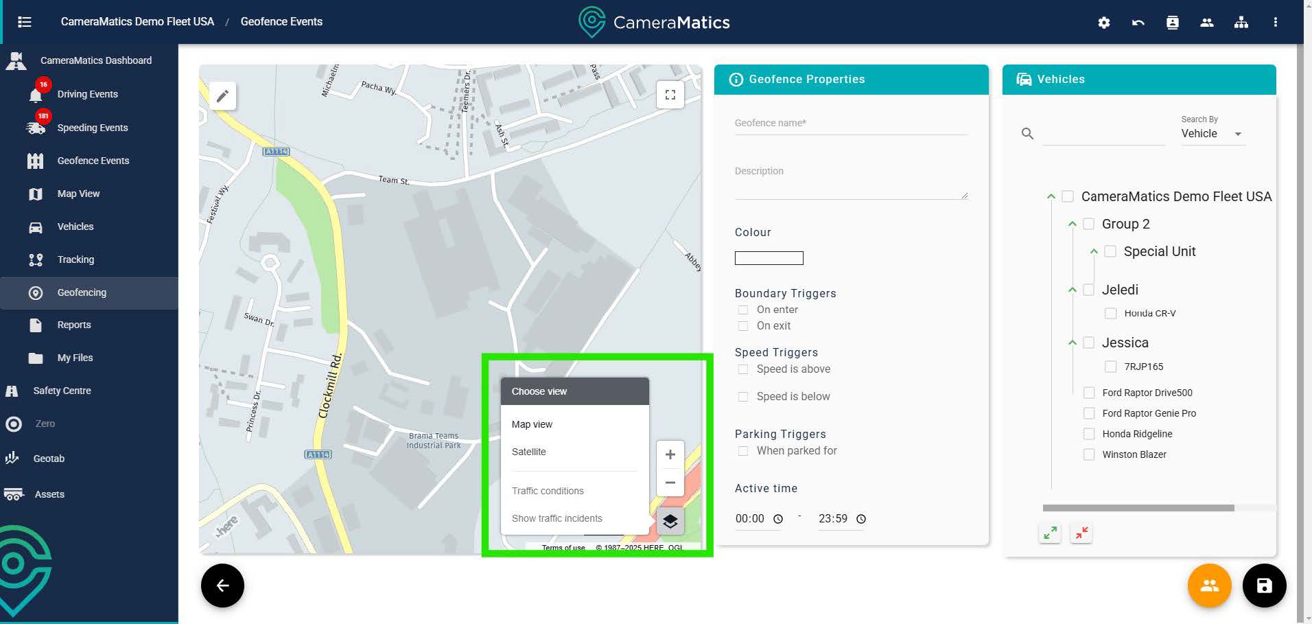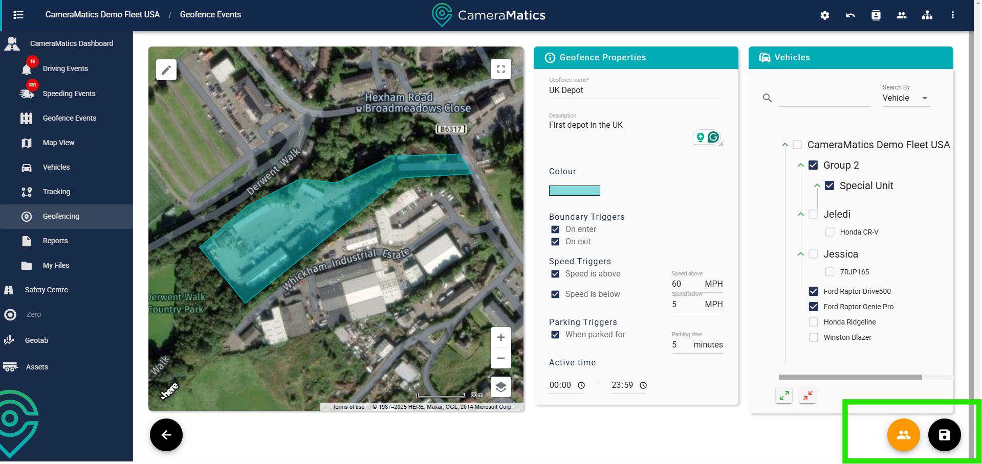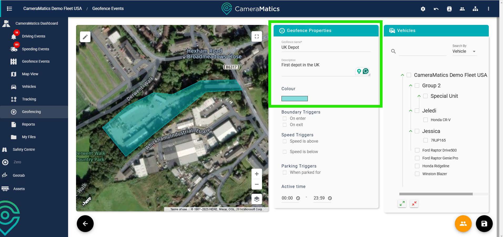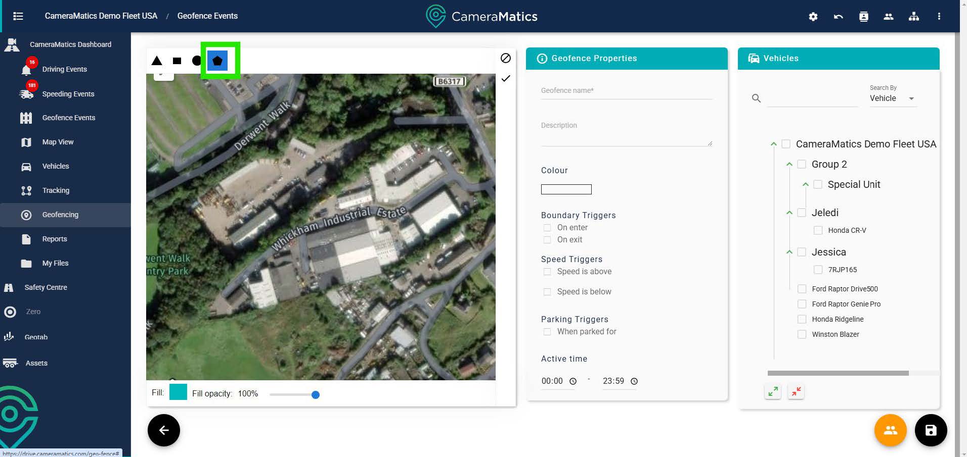 The geofence feature enables fleet managers to be alerted when vehicles enter, leave, dwell or speed in specific areas, at specific times. Geofences have multiple uses, from providing a record of all vehicles entering or leaving a work site, to preventing theft.