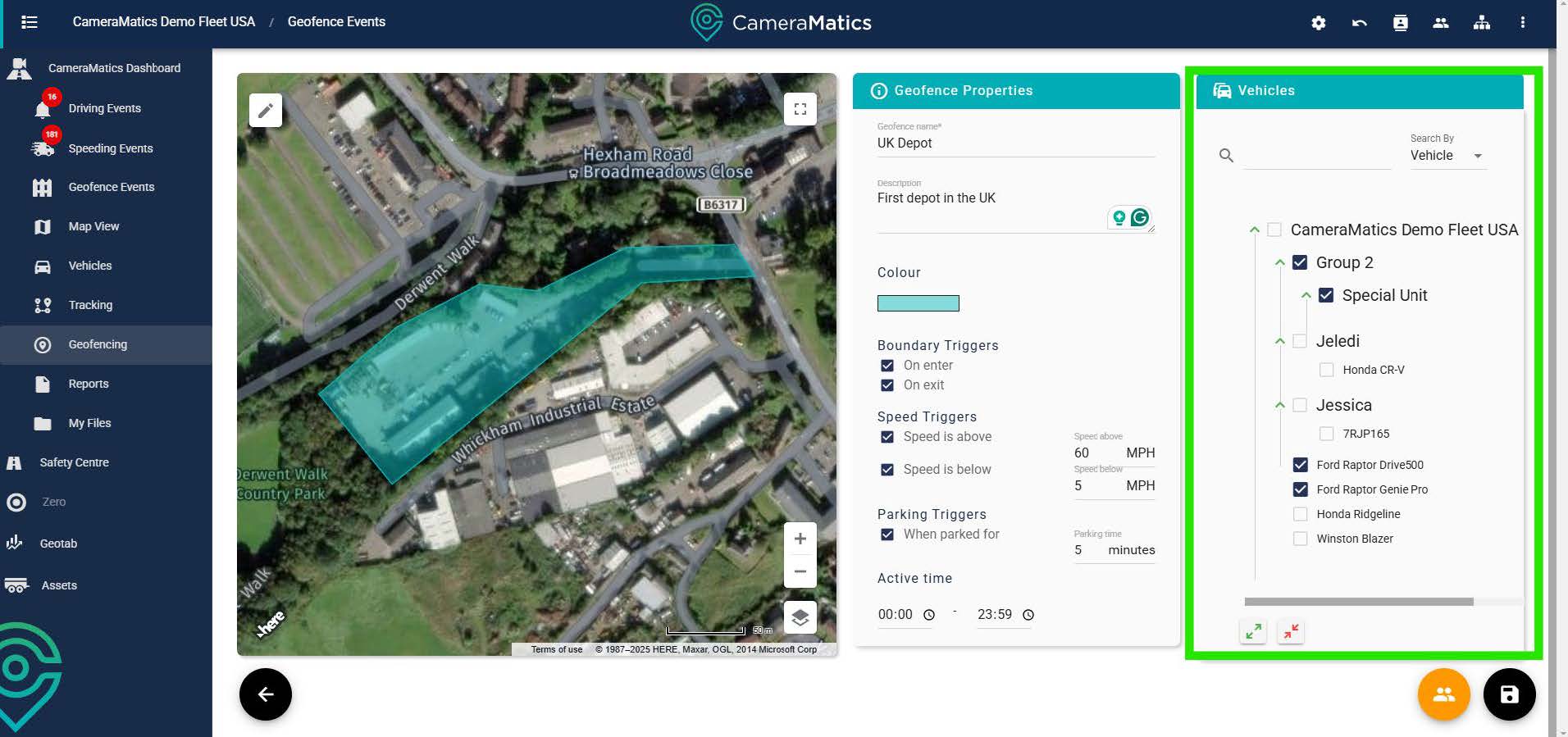 To the right, the structure of the company’s groups is displayed. You can either select a whole group or you can select individual vehicles to trigger geofence events. Of course, you can select the entire fleet by selecting the top group.