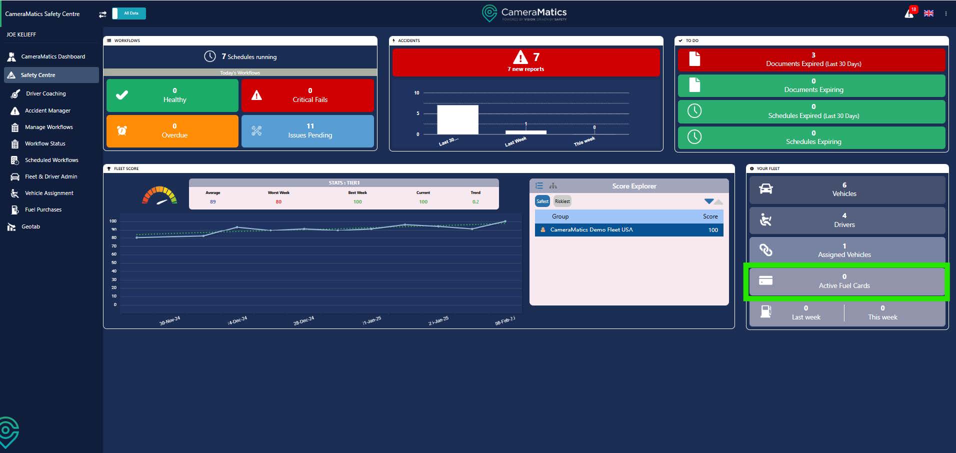 From the Safety Centre Dashboard, click on Active Fuel Cards in the right-hand widget.