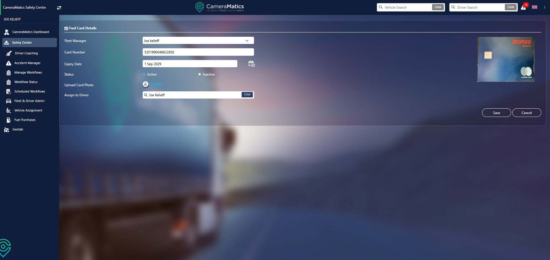 Fill out all of the details of the card. You can also upload a picture of the card if you wish to, and assign this card to any drivers who have access to it. This will allow them to upload receipts from the mobile app. Once done, click Save.
