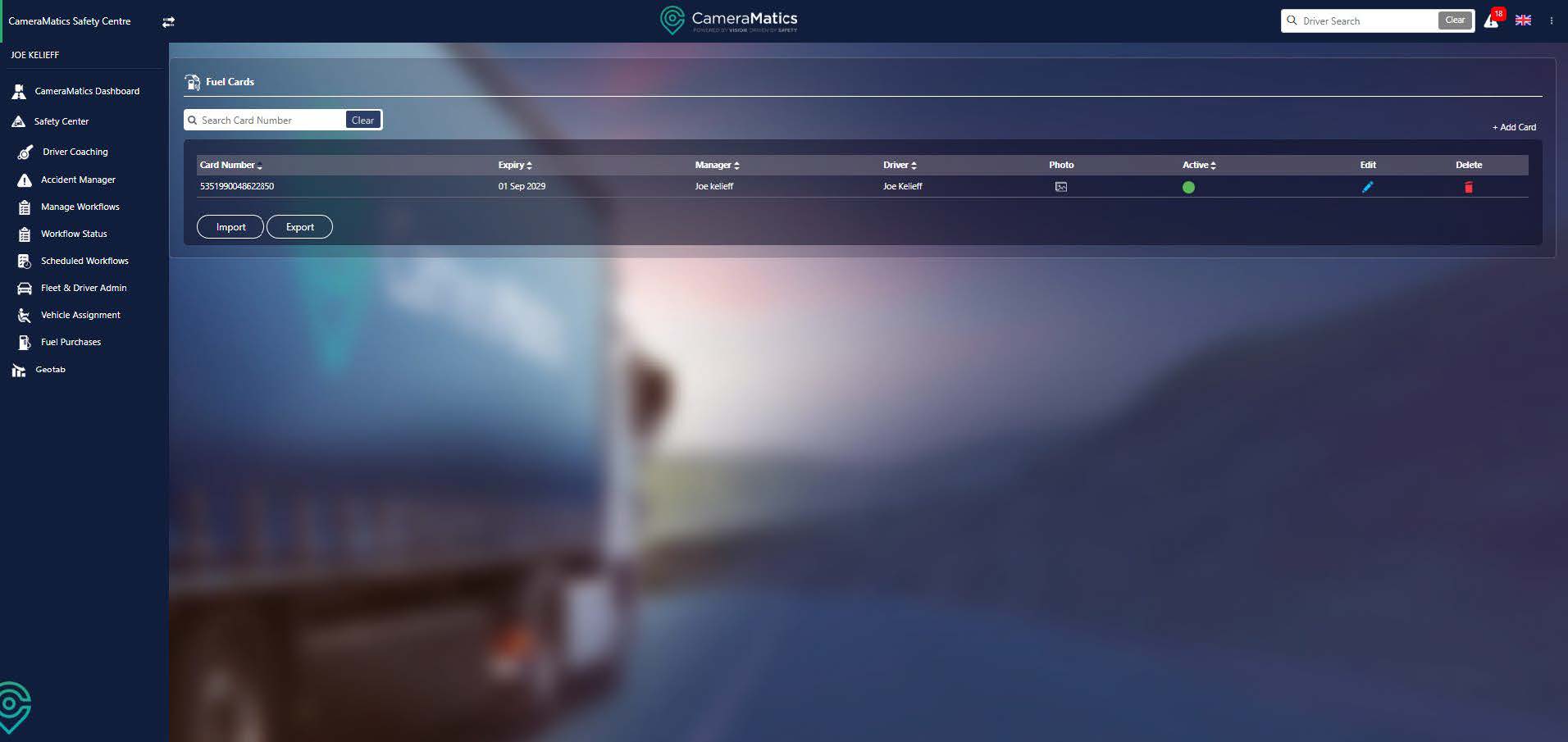Here you will find a full list of fuel cards in the system and the drivers assigned to them. To add a new fuel card, click on ‘add card’ in the top right.