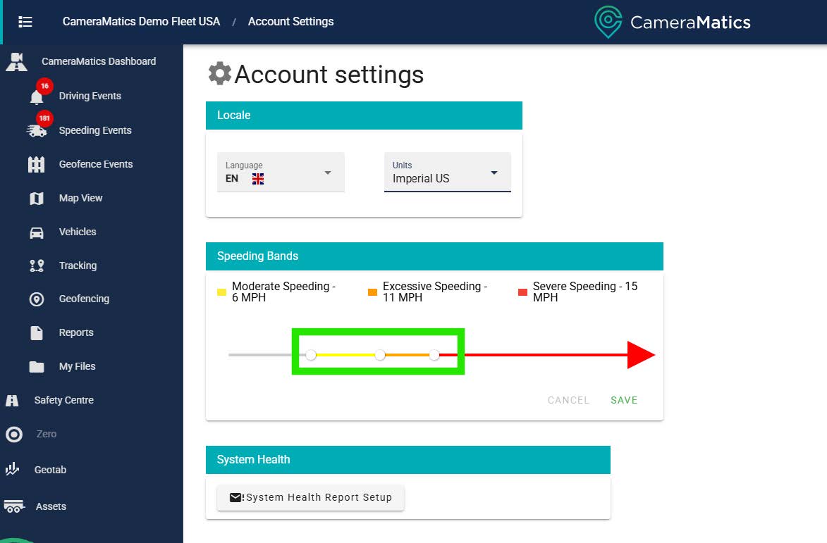 Speeding bands are used to define speeding events as moderate, excessive or severe, in terms of how they are reported in the dashboard.