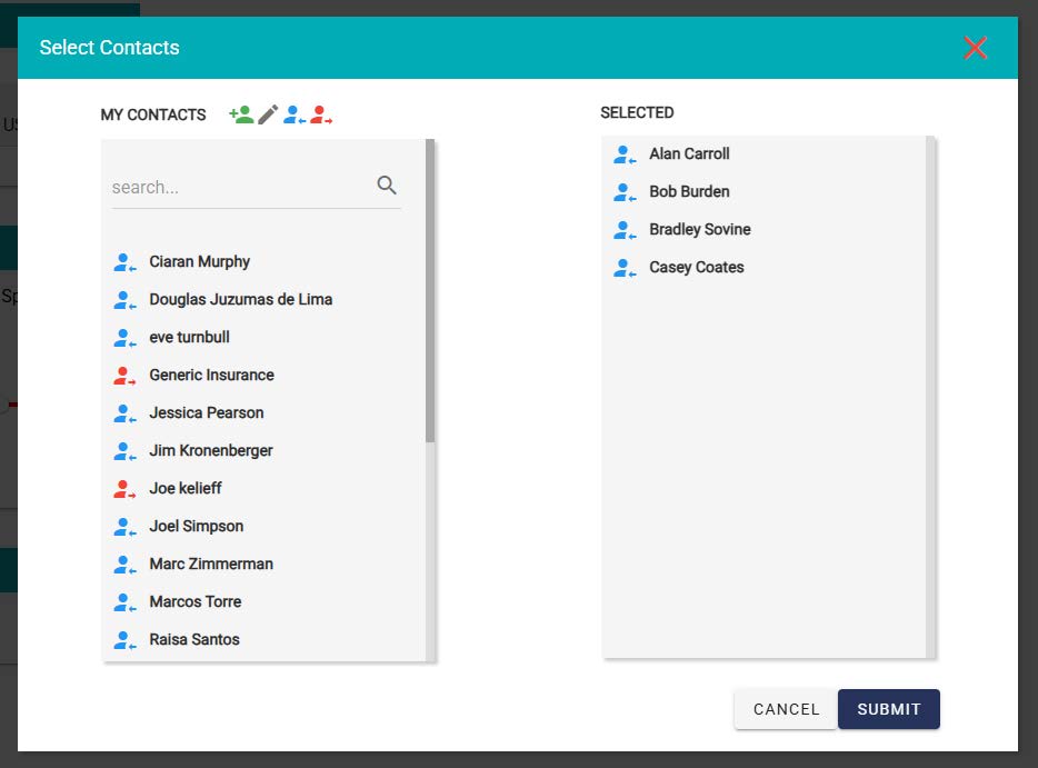 If you select Recipients, you will then get a full list of anyone that the report can go to. These are all the external and internal contacts that you have. Simply select who you want to receive the report, and click submit.