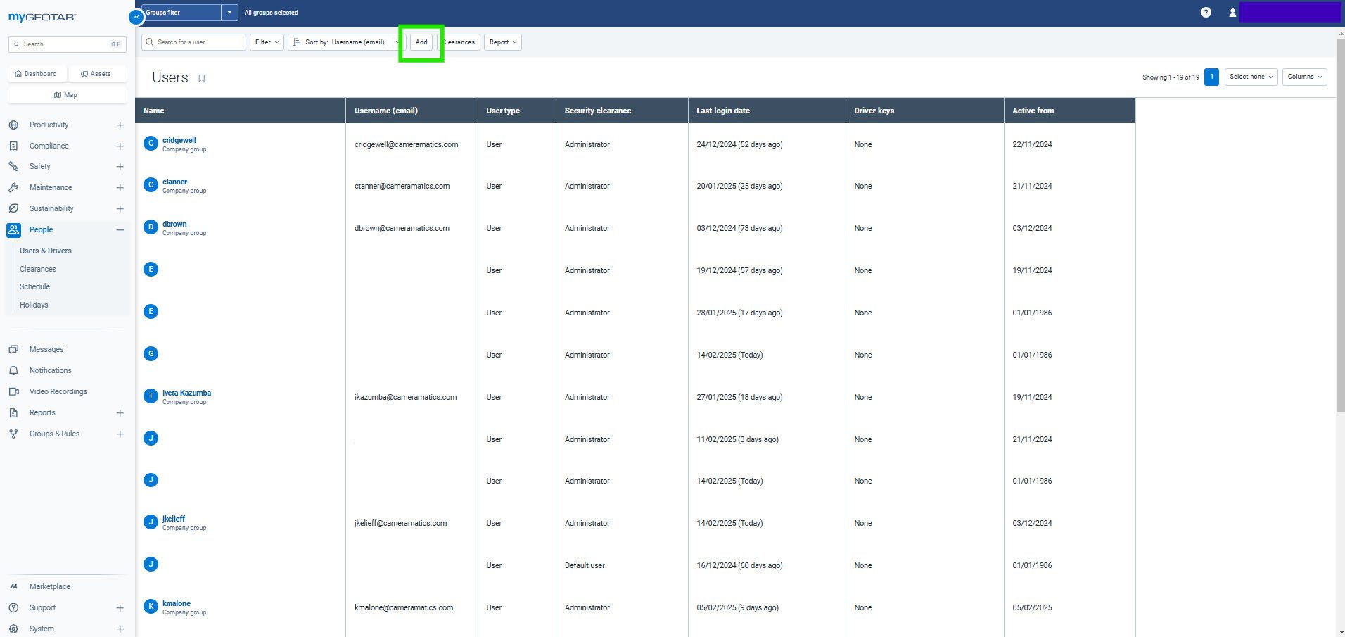 Here you will have the full list of Users and Drivers that have been created. From here you can click Add at the top to create a new User.
