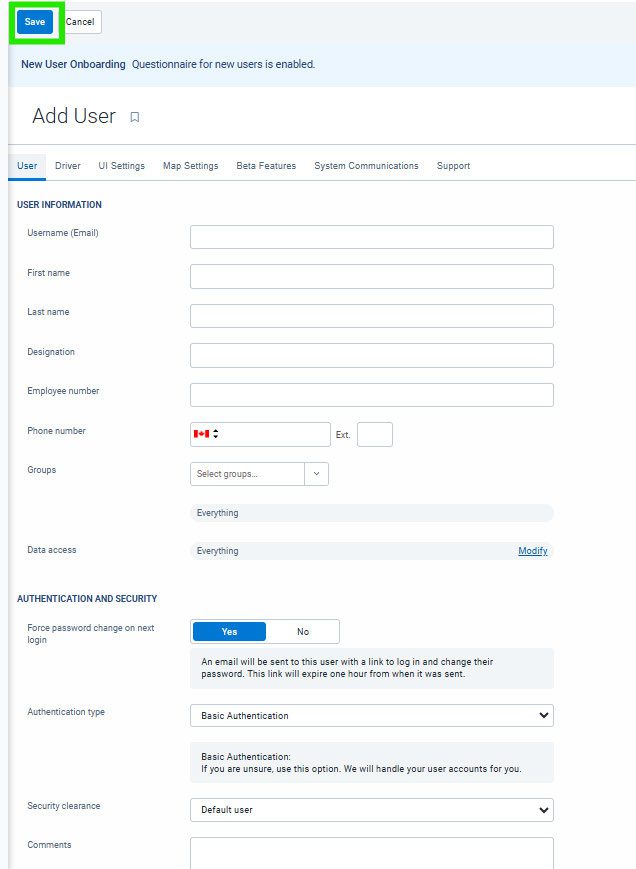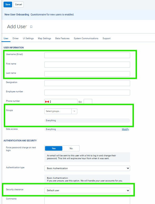 Next you will fill out their details ensuring the Username, First name and Last name have been filled out. You must also provide what level of security clearance this user will require. You can also then decide which group they will belong to, this will ensure they see what ever vehicles that are in this group.