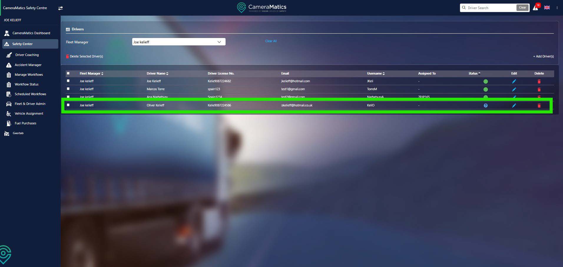 Click on the ‘Drivers’ tab within the ‘Your Fleet’ section to view the full list of your Drivers.