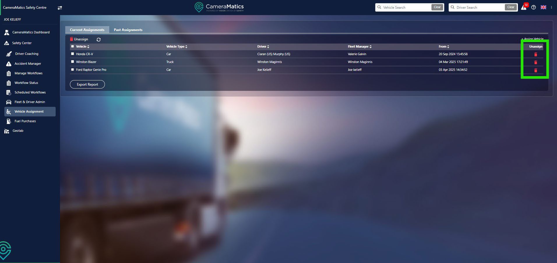 You will see how vehicles are currently assigned. You can unassign these by clicking the icon on the far right.
