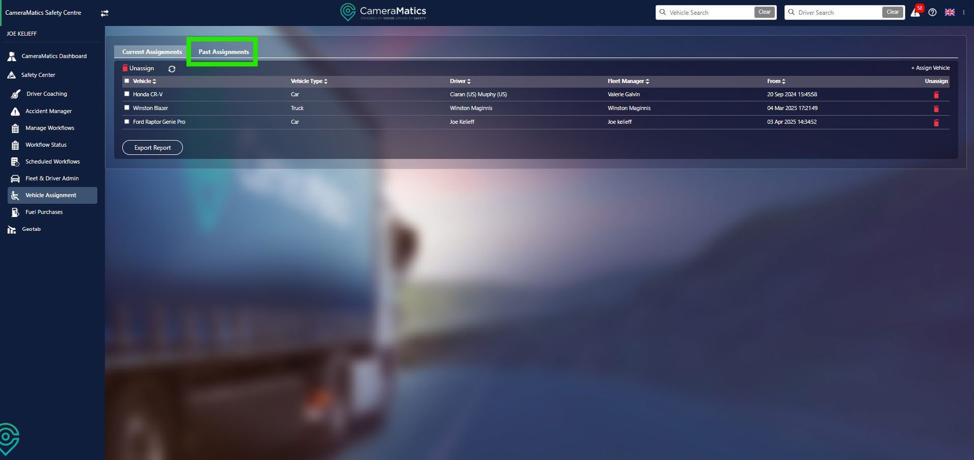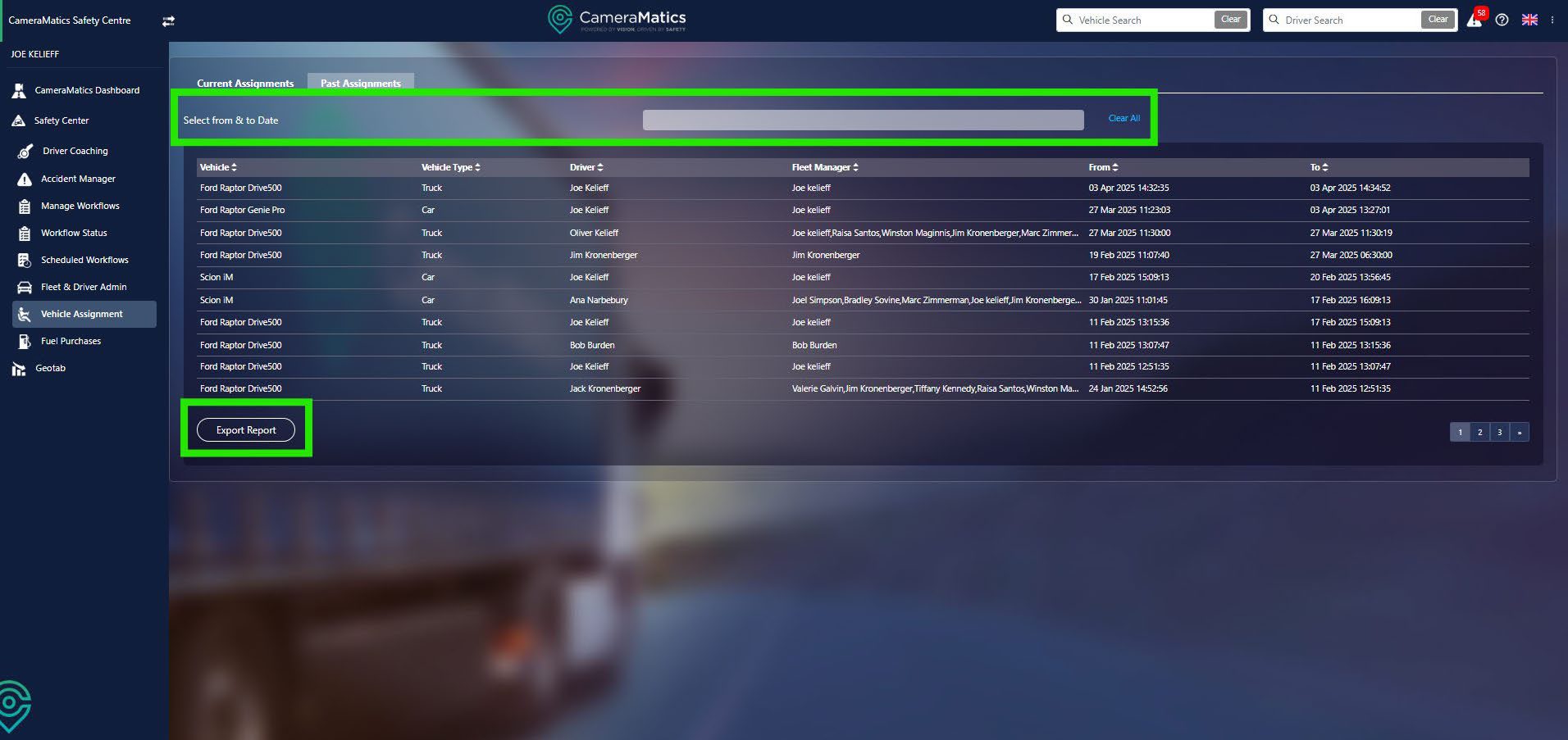 You can select a date range and view which vehicles have been assigned to which drivers within that range. You can also export this to an Excel sheet.