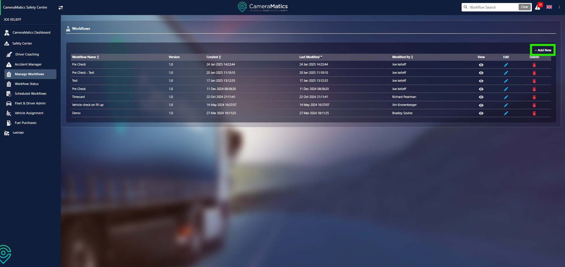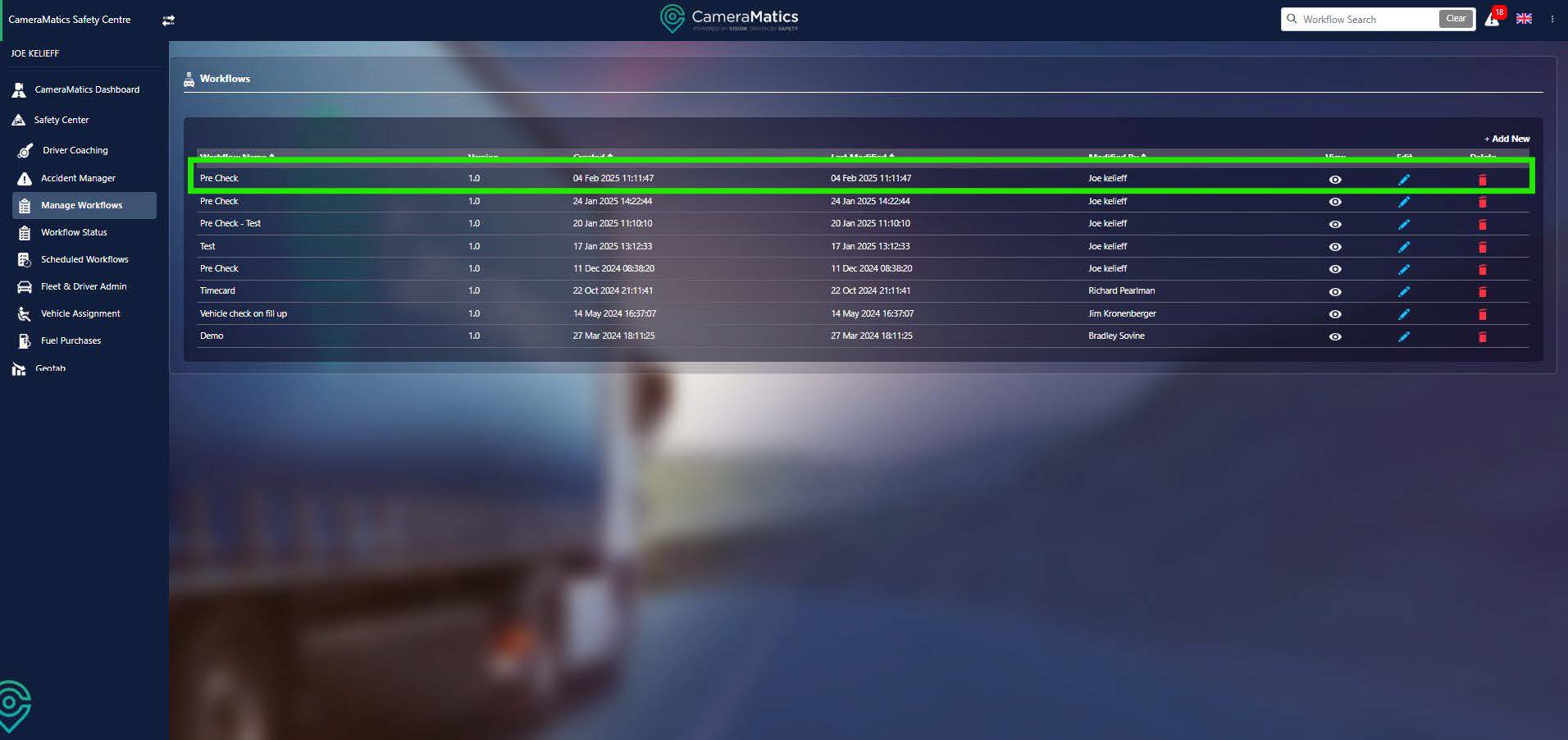 You will then see a full list of all workflows that have been created. You can examine, edit or delete these workflows from this list. To create a new workflow, click on Add New in the top right.