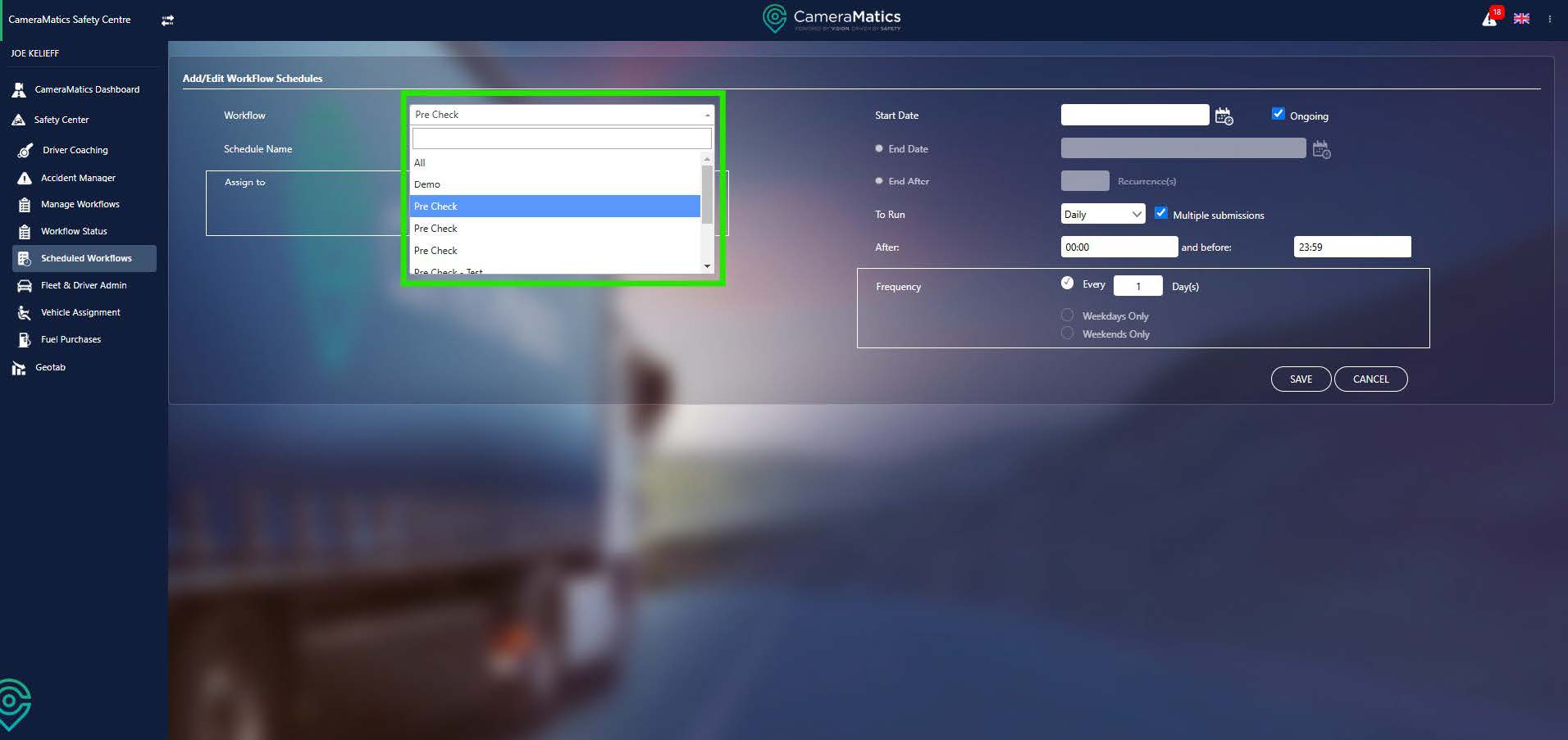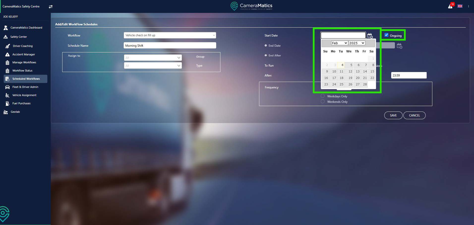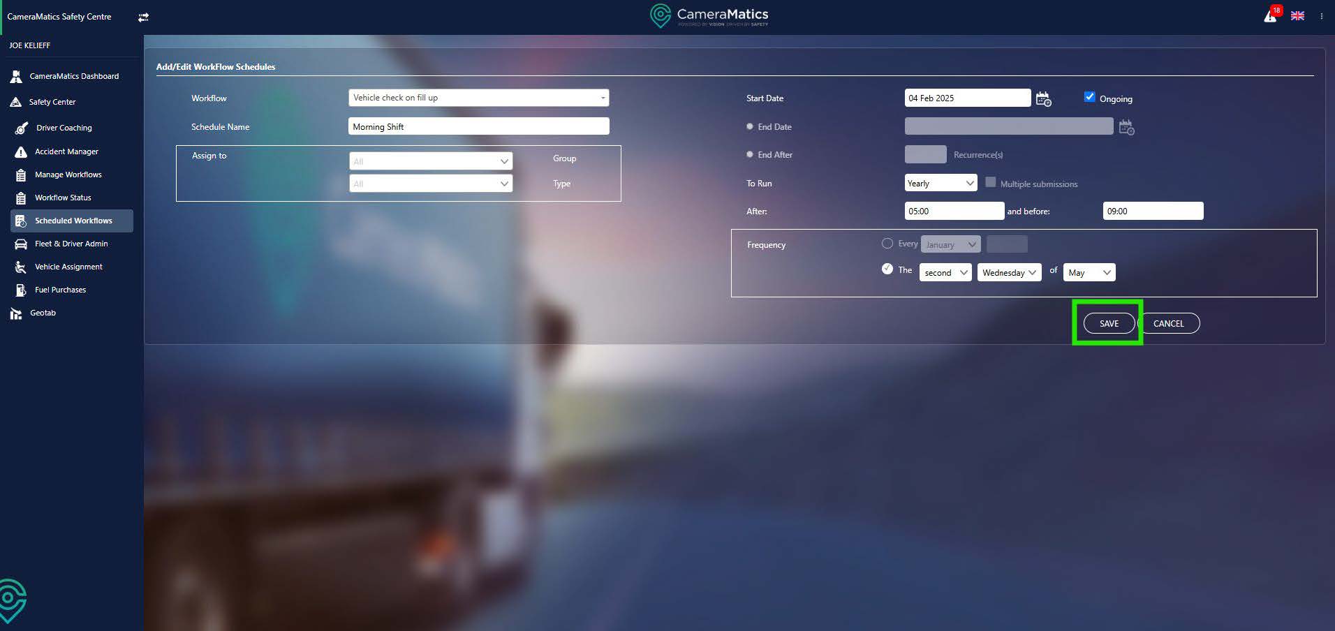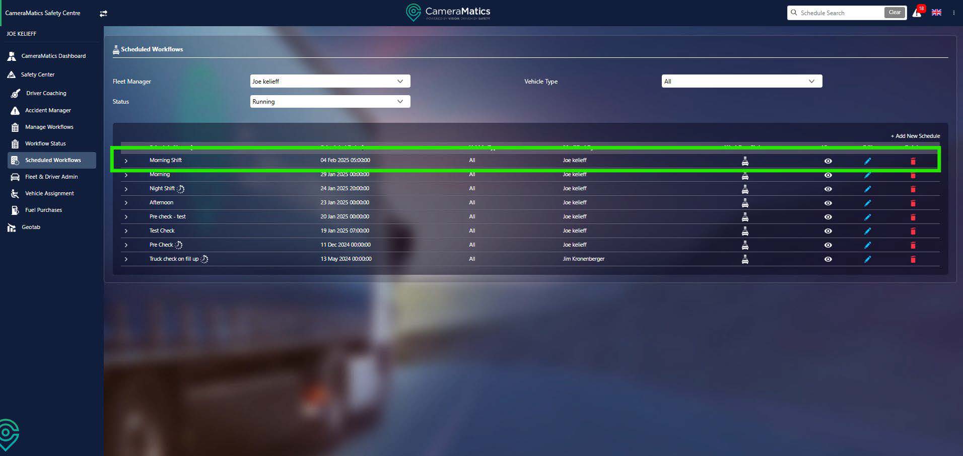 You will then be taken back to the list of schedules, with your new schedule added to this list. This means that the workflow the schedule is attached to is now available to your drivers within the CameraMatics SafeDriver mobile app.