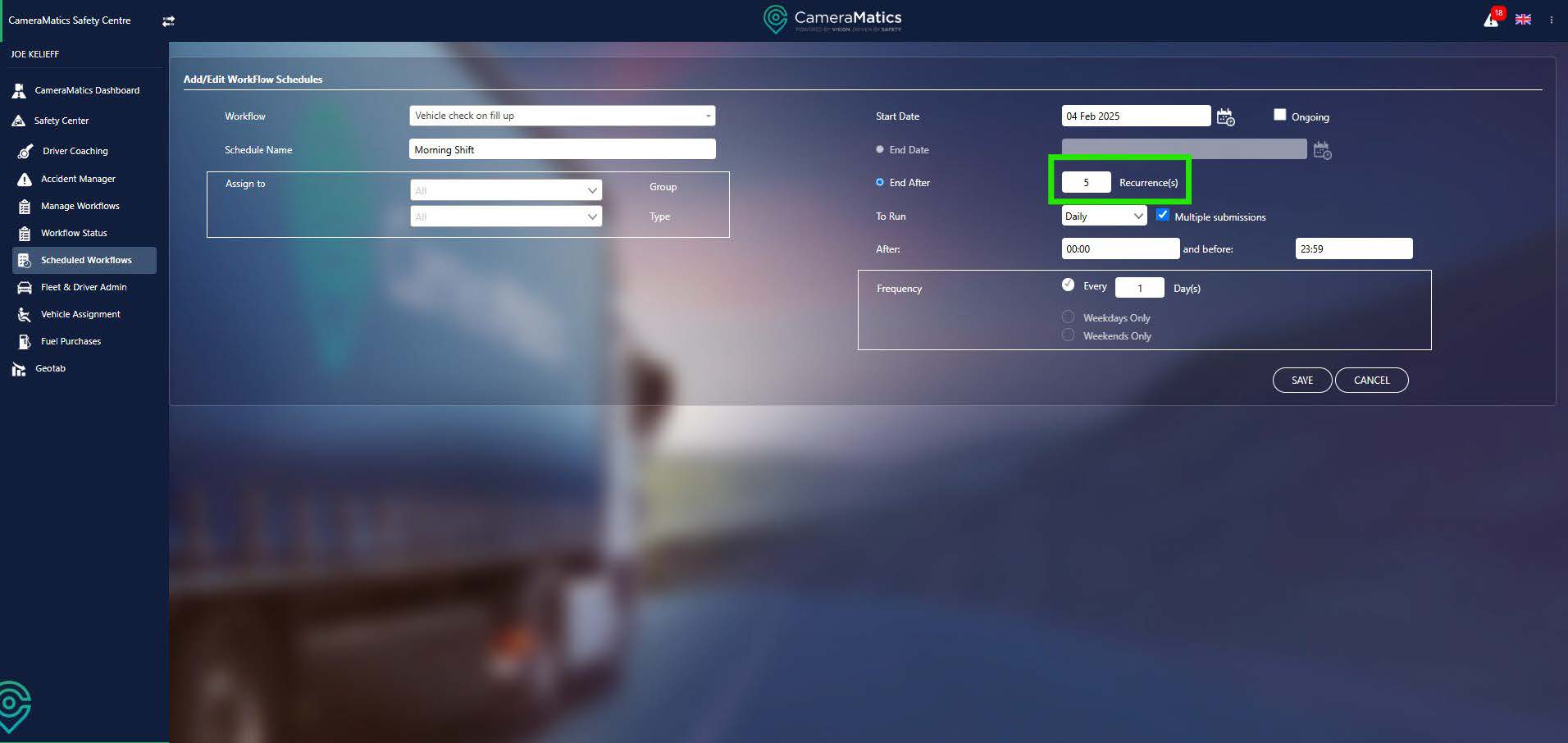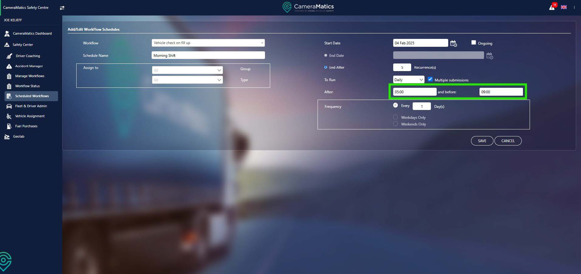 Next you can define a frequency for your schedule. You can decide if the workflow must be completed Daily, Weekly, Monthly or Yearly. If you uncheck the Multiple submissions, then your drivers can only submit it once per the selected frequency. On the other hand, if it is ticked then they can complete the workflow multiple times.