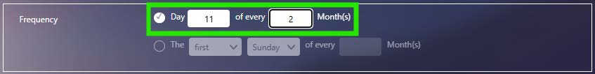Monthly workflows can be scheduled for the same date every month, or for every n months. This example shows a bi-monthly check on the 11th day: