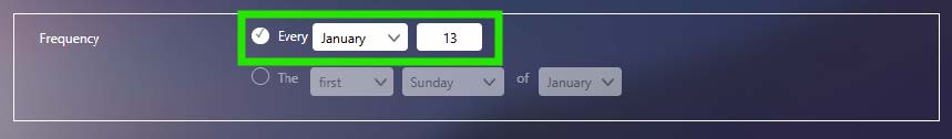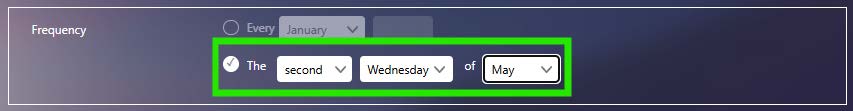 Alternatively, you can select this to be on a specific weekday within a specific month, such as the second Wednesday of May as shown here: