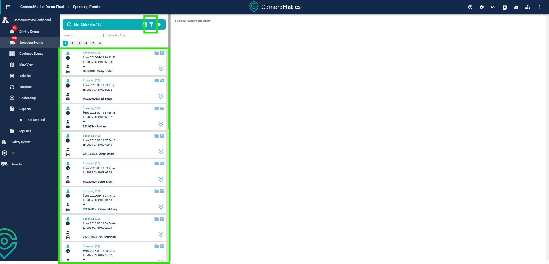 To view speeding events, first click on speeding events in the left-hand menu.