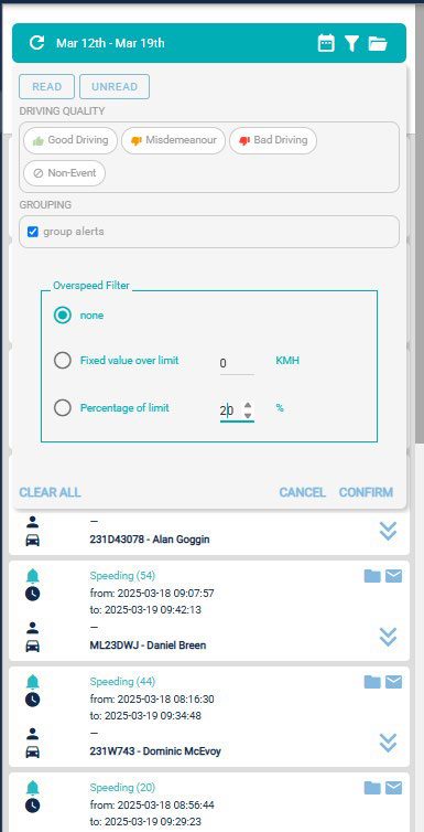 At the top of this list you can also filter this list by event type. For example, you can limit the view to events of a certain severity, such as 20% or over the speed limit.
