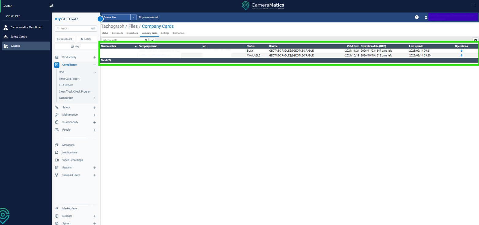 Once you get into this screen, you can then view the status of your Tacho Company Cards that have been linked to your account.